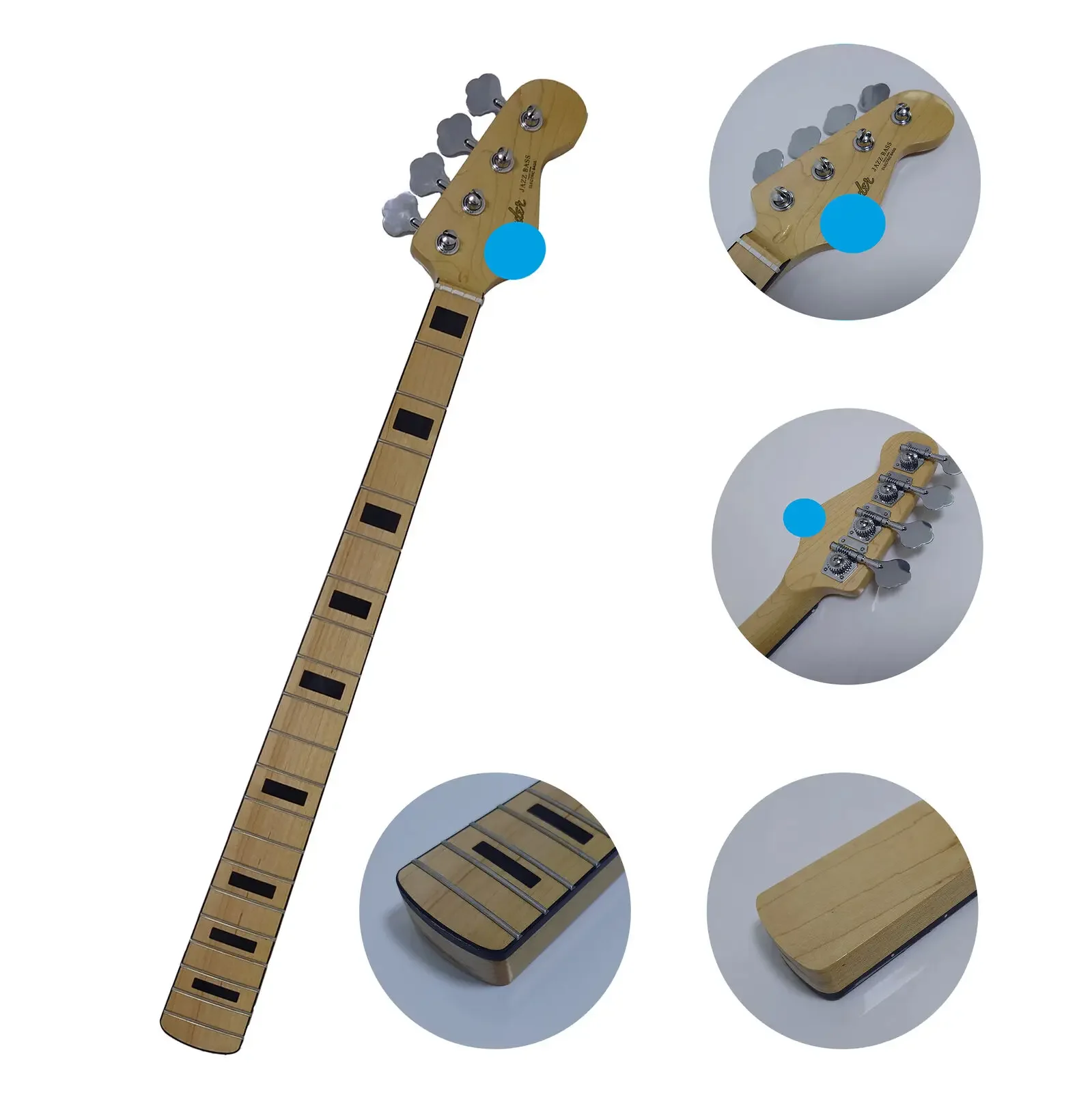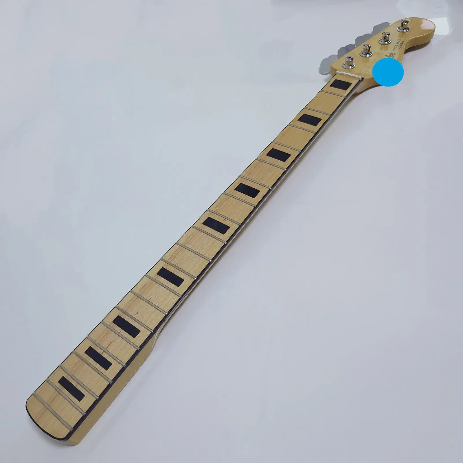 Experience exceptional quality with this stylish 4-string bass guitar neck, crafted for durability and precise playability. Made from strong maple wood, it features a polished, smooth finish that highlights natural wood grain. The 842 mm length provides comfortable access across 20 evenly spaced frets, adorned with contrasting black square inlays and side markers for accurate finger positioning. The neck's soft contours deliver a comfortable grip, ideal for extended playing. Equipped with four locking tuners, it ensures stable tuning and easy adjustments. The design emphasizes pragmatic function with a clean aesthetic, prioritizing reliability and performance. Whether you're replacing a worn neck or upgrading your bass, this component offers a seamless integration to enhance your instrument's sound and feel.