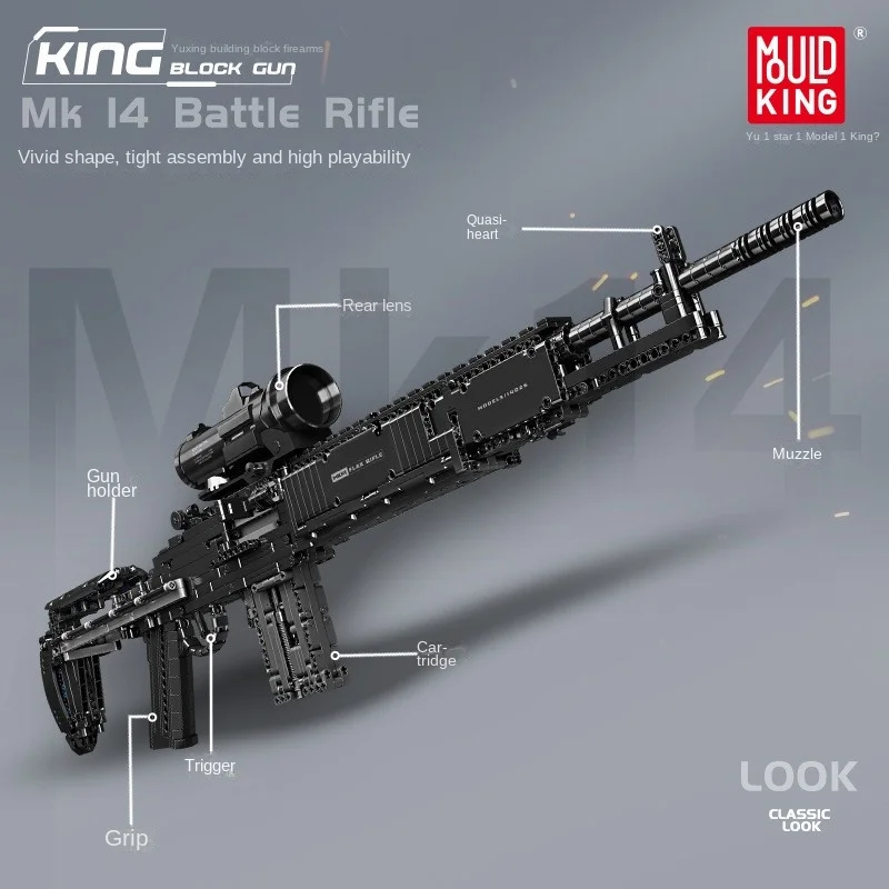 Transform your display collection with this highly detailed Yuxing Model King technWeapon Series MK14 Combat Rifle building block set. Crafted from durable ABS plastic with a sleek, matte black finish, the set features a realistic, tactical design including a long cylindrical barrel with grooved accents, a modern scope with a larger front lens, ergonomically curved textured stock, and segmented ribbed handguard. Suitable for ages 14 and up, this non-electronic, CE-certified model offers a precise, self-locking brick assembly compatible with standard blocks, creating an authentic miniature replica ideal for collectors and enthusiasts.