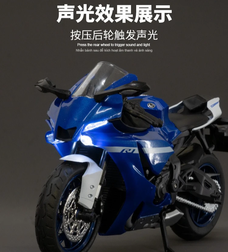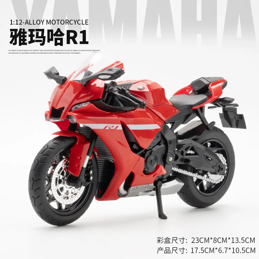 Step into the world of premium collectibles with this meticulously crafted 1:12 scale alloy YZF R1 motorcycle. Its sleek, aerodynamic design captures the essence of speed and agility, highlighting a vibrant red finish contrasted by black accents on the wheels, handlebars, and mirrors. The sporty graphics, including a prominent white stripe and “R1” marking, emphasize its modern, high-performance aesthetic. Equipped with integrated LED headlights that emit bright white light, and a transparent windshield adding a futuristic touch, this model is a stunning display piece. Perfectly balanced between realism and artistry, it invites enthusiasts to envision dynamic racing moments and stylish display options in any collection. A must-have for motorcycle lovers and collectors alike.