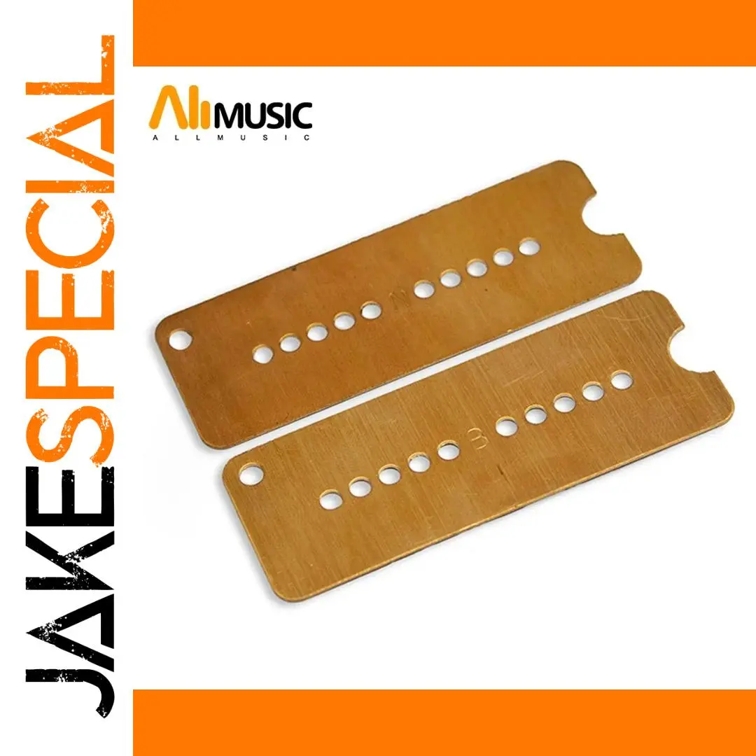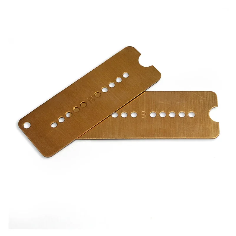 Transform your electric guitar with this premium set of brass P90 pickup baseplates from GETMUSIC. Crafted from durable brass, each baseplate measures 81x30mm and features a sleek, polished finish with a subtle brushed texture. The natural brass color adds a classic, metallic look that complements any guitar style. Designed for P90 pickups, the baseplates have precisely spaced pole pieces at 50mm for the neck and 52mm for the bridge, ensuring optimal sound and performance. These components are easy to install or replace, providing a reliable and stylish upgrade to your instrument’s pickups. Perfect for guitar enthusiasts who value both aesthetics and functionality, this set guarantees a sturdy and conductive base that enhances your guitar’s tone.