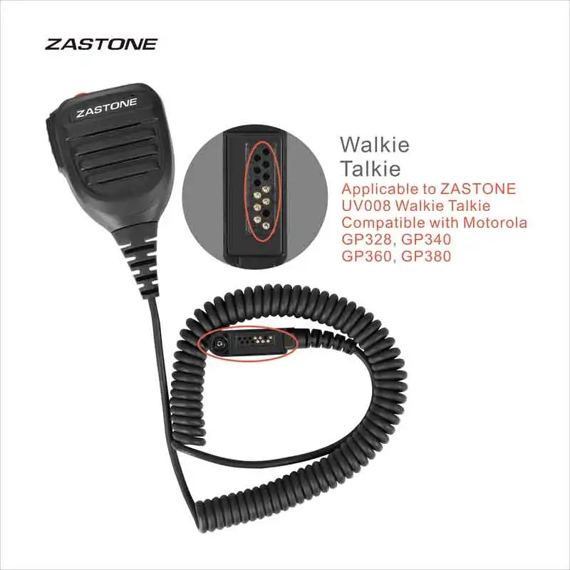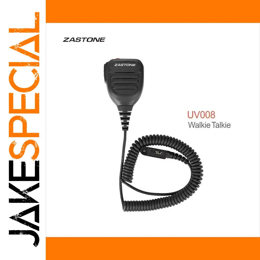 The ZASTONE UV008 walkie-talkie speaker microphone is designed to elevate your two-way radio communication experience. Its compact rectangular form, primarily black in color, offers a professional aesthetic. The textured surface enhances grip for extended use, while the speaker grille beneath the prominent brand name ensures clear audio output. A durable coiled cable provides flexibility, preventing tangles, and connects seamlessly to various Motorola models. Lightweight and practical, this microphone is engineered for everyday professional usage, making your communication effortless and efficient.