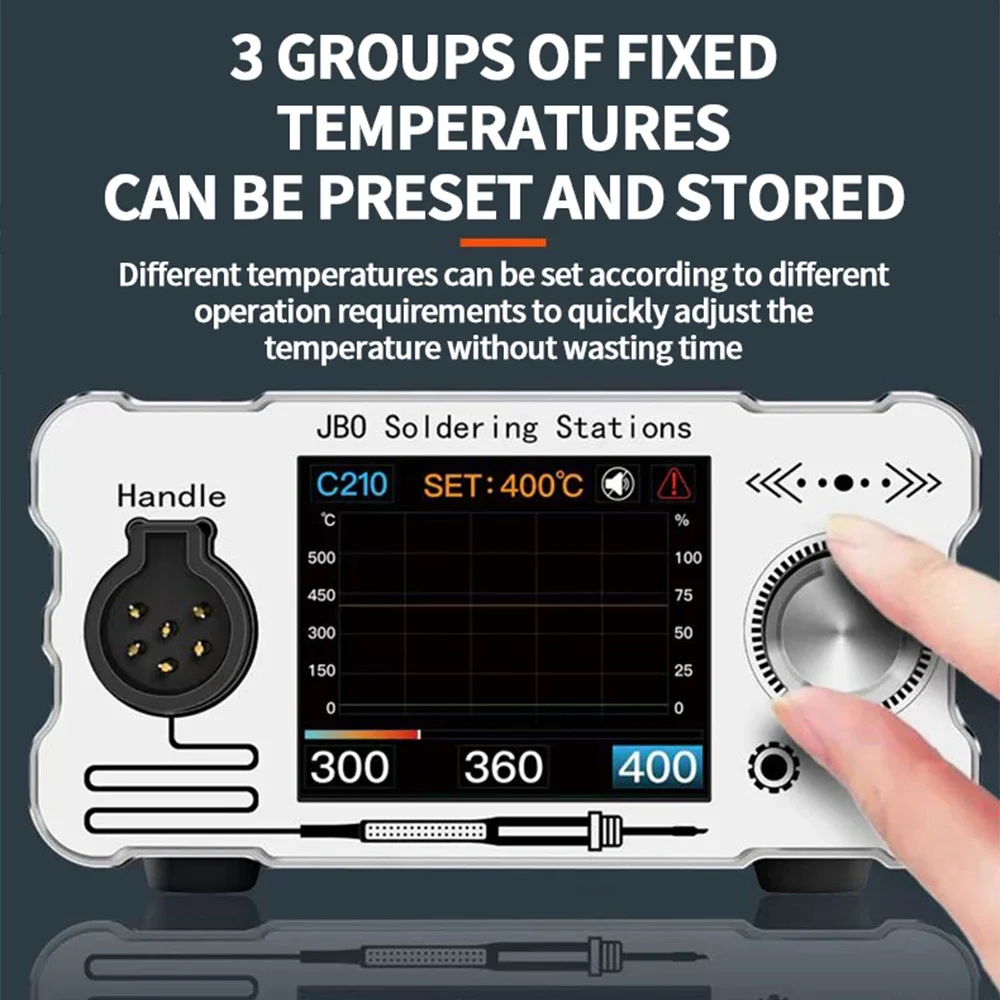 - Three preset temperature gears (e.g., 300°C, 360°C, 400°C) enable quick switching between common soldering temperatures, ensuring versatility for different components and tasks.