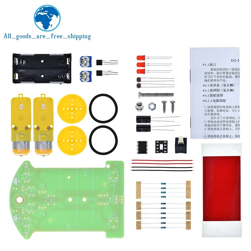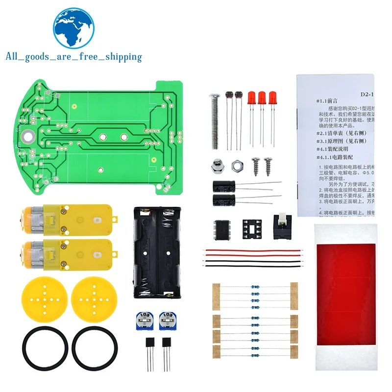 Experience hands-on innovation with this vibrant electronic DIY kit designed for creating intelligent line-tracking robots or small vehicles. Featuring a bright blue PCB with colorful components, it offers a lively, modern aesthetic suited for experimenters and enthusiasts alike. The main module, highlighted in a bold red box, incorporates an adjustable voltage regulator engineered for reliability across temperature ranges from -40°C to +85°C. The kit includes yellow wheels, sensors, servomotors, potentiometers, and a variety of connectors, providing everything needed for a versatile, customizable project. Designed for seamless integration with computer applications and sensors, this kit empowers you to bring your robotic ideas to life, whether for educational purposes, hobbyist experimentation, or advanced technical development.
