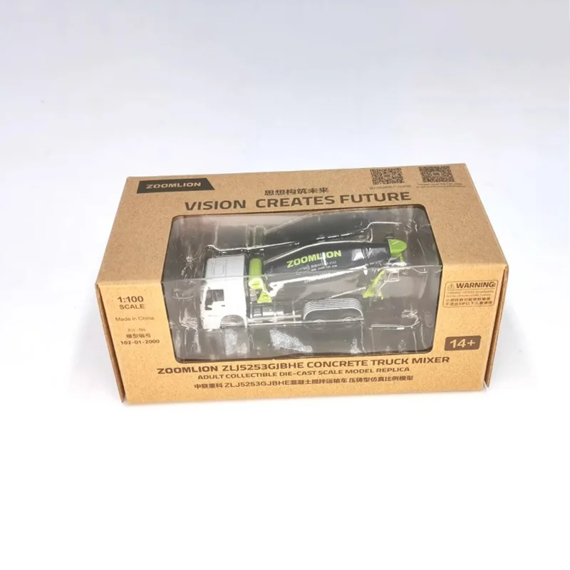 This highly detailed 1:100 scale diecast model of a Zoomlion ZLJ5253 concrete mixer truck features a durable alloy construction with a sleek white cab, clear windows, and a black mixer drum adorned with bright green accents and bold yellow-green “ZOOMLION” lettering. The model showcases realistic proportions, textured surfaces mimicking real drum surfaces, silver-rimmed black tires, support beams, hoses, and intricate structural details, embodying a precise industrial aesthetic. Perfect for collectors and enthusiasts, it is non-electric, safe for display, and presented in its original box, making it an ideal decorative piece or collectible ornament for ages 14 and above.